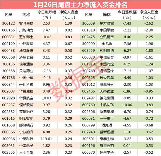 从个股尾盘资金流向数据看,有7股尾盘净流入资金超过5000万元,疫苗龙头智飞生物、川能动力、五矿稀土等个股尾盘资金净流入金额最多,分别高达1.39亿元、0.92亿元、0.83亿元;东方财富、中国平安、立讯精密等个股尾盘资金净流出金额最多。