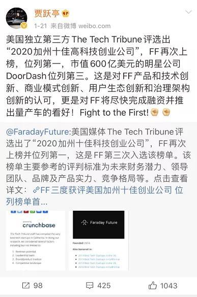 贾跃亭曾在个人微博上发文称:“美国独立第三方The Tech Tribune评选出‘2020加州十佳高科技创业公司’,FF再次上榜,位列第一,市值600亿美元的明星公司DoorDash位列第三。”且其微博上多次发布了FF91的最新进展。据悉,目前FF旗下车型FF91预量产车已组装完成,已在测试阶段。