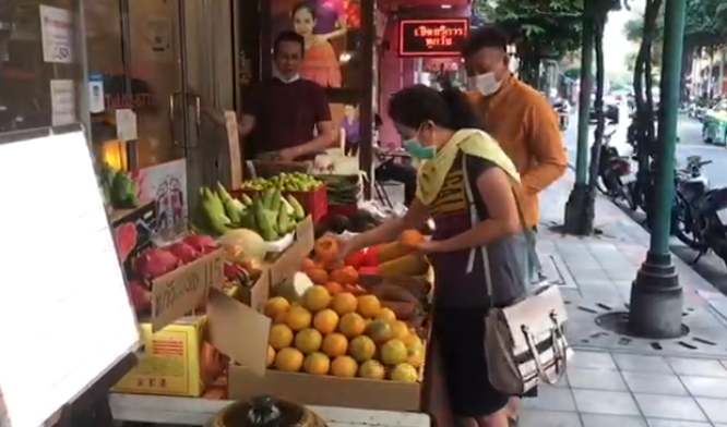 泰国曼谷传统泰式按摩店合伙人 尤(Yo):由于新冠疫情,泰国政府要求关闭所有按摩店。我们关门已经差不多有一个月了,但是要照顾我们的员工,不能解雇他们,所以我们在按摩店门口摆了这样的蔬菜水果摊位,以渡难关。这些蔬菜水果多半是我们自家菜园子里种的。今天(22日)我们第一天开门重新营业,但到现在为止还有没有任何顾客,我们按摩店都经过严格的消杀,非常卫生,希望来按摩的顾客对我们有信心。