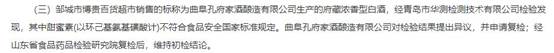 其中,邹城市博贵百货超市销售的标称为曲阜孔府家酒酿造有限公司生产的府藏浓香型白酒,经青岛市华测检测技术有限公司检验发现,其中甜蜜素(以环己基氨基磺酸计)不符合食品安全国家标准规定。曲阜孔府家酒酿造有限公司对检验结果提出异议,并申请复检;经山东省食品药品检验研究院复检后,维持初检结论。