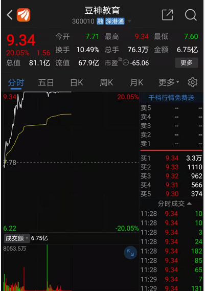 今天早盘该股小幅低开,盘初一度创出2019年6月以来新低价7.6元,随后直线拉升,10点零5分钟左右封上涨停板。豆神教育股价走势颇有利空出尽的意味,在计提20多亿元的商誉后,公司账面上的商誉仅剩不到8亿元,后面商誉再暴雷的风险大大降低。此前,该股去年26元的高位一度暴跌70%左右,回调比较充分。豆神教育机构关注度也较高,有10多家机构评级。
