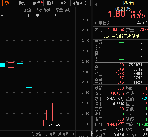 不仅仅是豆神教育,今天涨停板上还有多只业绩预亏股。其中,去年年报预亏8.06亿元至9.98亿元的二三四五今天早盘涨停,该股昨日晚间发布公告,拟使用2.5亿元至5亿元以集中竞价交易方式回购公司部分社会公众股份,回购价格不超过3.28元/股。