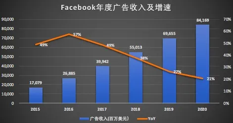 (数据来源/财报;制图/异观财经)从年度财报来看,2020财年,即使受到新冠疫情的影响,Facebook的业务总体保持了较为稳定的发展。2020全年营收859.65亿美元,同比增长22%。其中,广告收入841.69亿美元,比2019年的696.55亿美元,增长21%。