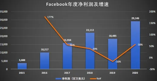 受卫生事件影响,人们线下活动受到限制,让人们对线上社交活动更加依赖,对Facebook用户数量增长起到了积极作用。
