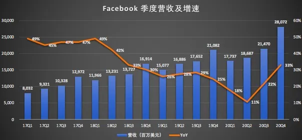 当线下营销活动受阻时,更多企业把营销预算转移到线上,这对以广告业务为主的互联网平台来说是利好的,这在Facebook的财报也有所体现。财报数据显示,从2020年Q3开始,Facebook营收同比增速开始复苏,逐步恢复至20%以上的增速。财报数据显示,2020年第三、四季度营收同比增速分别为22%和33%。
