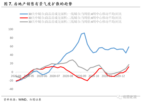 二是把手头攒着的土地转为新开工,这样房企才可以拿到开发贷,同时尽快达到预售条件,加速推盘和销售款回流。三是尽快把一直拖着的房地产项目给竣工了,通过竣工确认收入利润,降低负债率,进而打开融资空间。1月中旬以来,玻璃、PVC等竣工建材价格出现了新一轮反弹,可能预示着地产竣工节奏正在加快。随着部分一线城市楼市表现火爆,一线和核心二线城市调控在加码,在银行住房信贷集中度倒逼压力之下,部分银行的房地产贷款没有了额度,房贷利率也在往上走,房地产调控从房地产企业的融资端压到了个人住房端。住房市场信贷收紧和调控政策对房企的影响得一分为二来看:1、如果房地产销售端下行幅度超预期,那对房企来说,确实压力是非常大的,因为随着房企融资偏紧,整个现金回款高度依赖房地产销售,房地产销售占了资金来源的50%以上,如果房地产销售出现快速下行,那无论是房地产新开工环节还是施工到竣工环节,都会受到非常大的冲击,正常的房子交付都成为了问题。2、目前调控的范围主要在一线和核心二线城市,一线城市房地产上涨主要逻辑是在货币供给过剩下的稀缺性溢价,过剩流动性追逐少数确定性标的的趋势并没有发生改变,这意味着在短期房地产销售环节的景气度会扩散,扩散到一些具有基本面确定性但估值不那么高的核心二、三线。