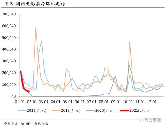 这次疫情主要出现在北方地区,由于北方冬天天气寒冷,本来1月北方地区工业生产活动就比较弱,停工、停产造成的额外冲击不会太大。如果只是小范围的疫情爆发,由于没必要采取极端的限制运输和停工停产措施,各地应对疫情经验充分,已经能在防疫和保生产之间取得平衡,其他地区只要日常的防疫措施做好,生产活动几乎不会受到影响。所以,只要疫情不出现严重扩散,对全国范围内的工业生产冲击相当有限。真正受影响大的是消费。因为对于消费来说,一旦疫情有了扩散的苗头,哪怕只是局部地区爆发和零星的案例,也会使得民众的外出消费的意愿被抑制。近期国内票房收入、餐饮娱乐APP活跃度、乘用车零售、地铁客运量等高频数据,普遍出现了环比下行趋势,季节性对比也普遍不如历史同期,显示出消费和出行活动的确在弱化。