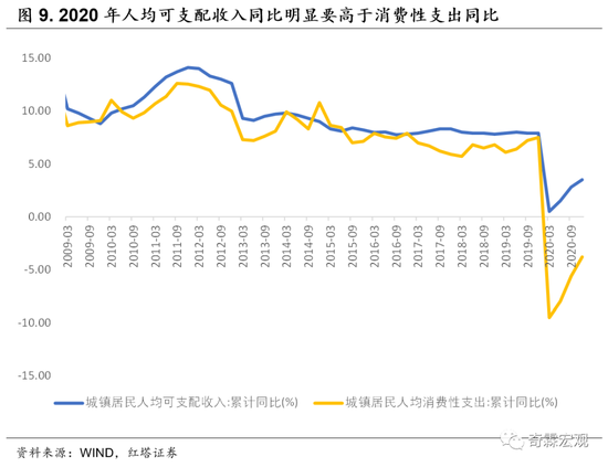 一方面,这是因为疫情影响了居民就业、收入,进而损害了居民消费能力,但这一点可能解释力有限。数据上来看,2020年城镇居民人均可支配收入同比增速的确下滑了,但仍然有3.5%的读数,而人均消费性支出则只有-3.8%,两者裂口为历史最大,这说明仍然有很大一部分收入没有转化为消费。