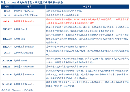 2013年5月,时任美联储主席的伯南克在国会听证会的证词中明确货币政策委员会正在准备增加或减少资产购买的步伐,以确保货币政策立场在劳动力与通胀前景发生变化时及时进行调整,这被市场解读为美联储明确了taper的前瞻指引,并引发当时市场的“缩减恐慌”(taper tantrum)。后续在2013年全年,美联储议息会议及各类官员演讲中多次提及放缓资产购买计划。
