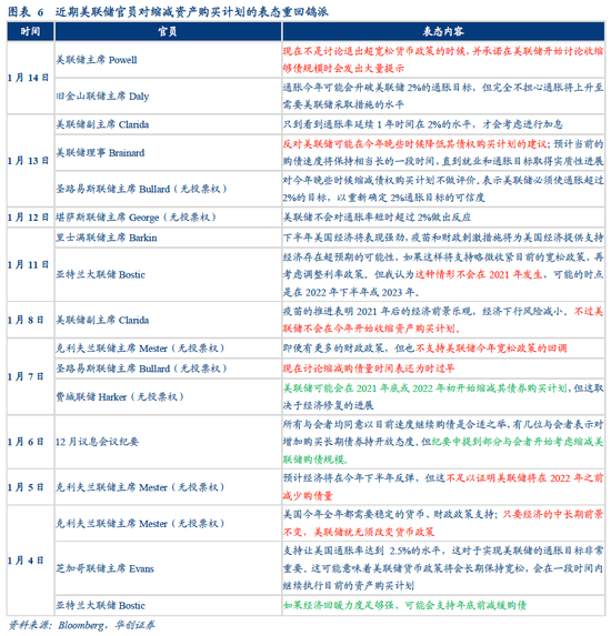 短期来看,此次议息会议中强调经济修复前景还不明朗,因此上半年美联储或将淡化缩减资产购买计划的表态;另外考虑到2013年taper tantrum的前车之鉴,美联储在预期管理上或也会更为谨慎。从经济基本面的来看,由于疫苗接种进度以及拜登政府财政刺激政策能否顺利落地尚存不确定性,因此经济增长前景并不明朗,货币政策预计也难有明确转向收紧的路径。可以看到在2020年12月FOMC会议纪要以及今年1月初提及Taper后,美联储近期的官员表态显著转鸽,鲍威尔也在讲话中明确表示现在不是讨论退出超宽松货币政策的时候,因此预计短期还比较难看到美联储货币政策转向对资产价格形成冲击。不过,由于美联储提出Taper即标志着美债利率见底,因此当前处于Taper一阶段向二阶段过渡期,美债利率或已进入触底反弹期。