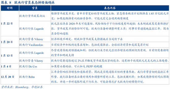 三则,欧央行货币政策延续宽松,且欧元汇率快速升值已成为欧央行的重要关注点。通过复盘2013年可知当时美元指数未上行主要源自欧央行政策较美联储更为紧缩,而当前则处于美联储货币政策边际变化较欧央行更为紧缩的状态,因此美元指数的走势或与2013年不同。近期欧央行官员表态一致偏鸽,未来货币政策不排除进一步宽松的可能。更值得关注的是,1月欧央行议息会议中,拉加德表示欧央行正密切关注欧元汇率,欧央行对欧元汇率快速升值导致的欧洲经济复苏、通胀冲击可能容忍度不会太高,货币政策或将进一步宽松。