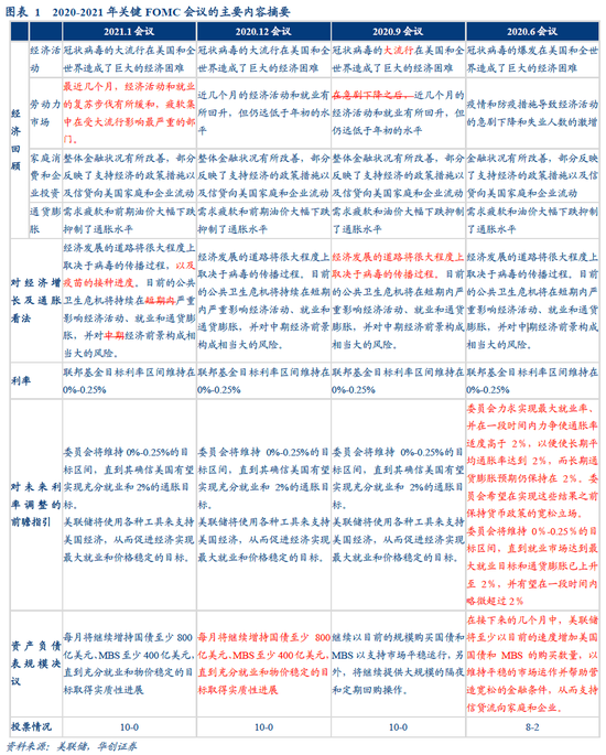 1、经济前景:美联储一改12月对经济修复回升的观点,在发布会中不断强调未来经济前景的不确定性,就业与通胀均受到疫情反复的影响而出现回落,经济修复距离目标仍然很远。同时今年通胀水平可能会因去年的低基数而走高,但这不会带来长期性的影响,因此美联储不会对暂时性的通胀做出反应。