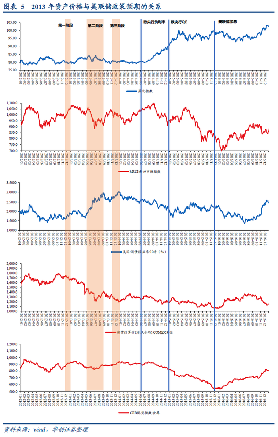 2012年12月议息会议纪要首次提及Taper后,10年期美债利率开始温和上行,2012年底1.6%左右提升至2013年4月的2%左右、美元指数则由79小幅上行至84左右。此时黄金价格进入下行区间,不过当时新兴市场指数尚在上行,CRB金属指数仍延续上行趋势。