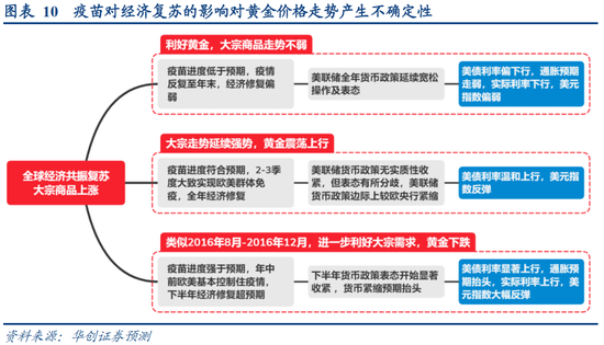 情景三:疫苗进度强于预期,下半年经济修复超预期,资产价格类似2016年8-12月,进一步利好大宗商品需求,但黄金下跌。此种情景下美联储或在下半年开始明显出现政策表态的收紧,美债利率显著上行,通胀预期再度抬头,实际利率上行。