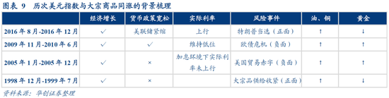 通常来说,由于大宗商品以美元定价,因此历史上与美元指数的走势往往负相关,即美元上行阶段大宗商品走势偏弱。但通过复盘过去20年美元指数与大宗商品的走势,可以看到在特定的宏观背景下,存在美元与大宗同涨的可能。即:大宗商品走势的核心在于经济基本面,如果基本面带来大宗商品需求端旺盛,则大宗商品牛市不会因美元指数上行而终止。而黄金走势的核心在于实际利率,不论货币政策是否宽松,只要实际利率走势偏弱,黄金也可与美元同涨。