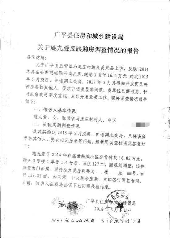 施九爱通过层层信访后不久,广平县住房和城乡建设局安排时任房管所所长袁保华负责调解。