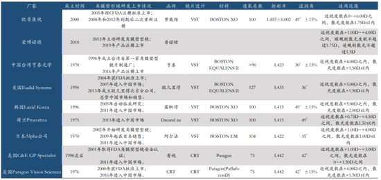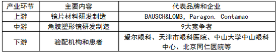 在上游端,国产与进口角膜塑形的材料供应较为集中。目前市面上的角膜塑形镜使用的主要材料有Boston系列、Paragon HDS 100、Roflufoncon E,三者分别来自美国Bausch & Lomb、英国Contamac(2017年被昊海生科收购)、美国Paragon。下游端主要是各大医院、验配机构以及患者。