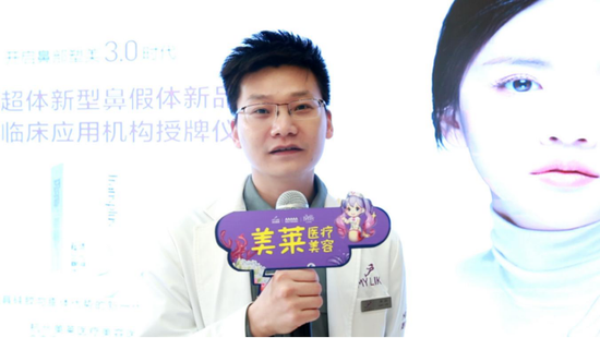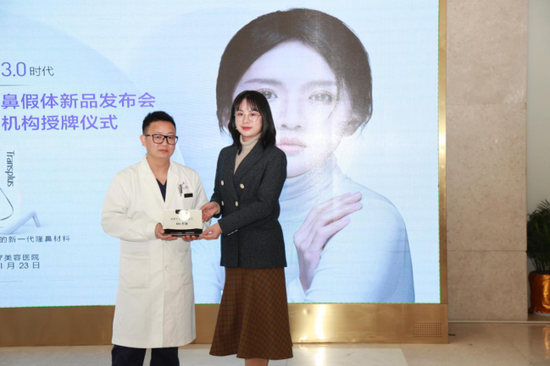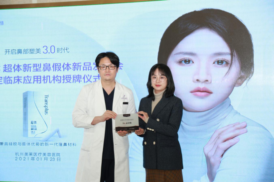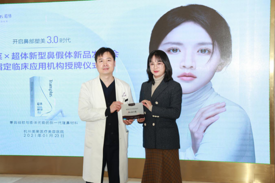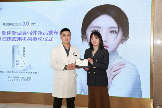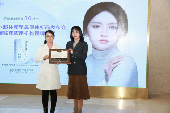 活动现场,杭州美莱美容外科行政经理张霞娟代表我院接受超体鼻假体指定临床应用机构授牌。