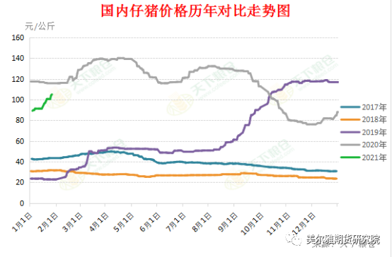 如果要关注9月份生猪的猪源供应情况,应该将重点放在1-3月的仔猪出生保育,或者3-5月份的仔猪销售情况上。同理11月份的猪应该关注现在和下个月的母猪配种情况,2022年1月的猪应该关注现在的后备母猪情况。然而现实有时比较遗憾,今年冬季受到非洲猪瘟疫情加上疫苗毒以及天气的影响仔猪和母猪的保育情况不佳。前文已述,后备母猪价格居高不下,同时根据天下粮仓的报道,今年冬季的仔猪断奶成活率较正常水平降低约3%,现阶段15kg仔猪的价格居高不下甚至有一定上行趋势也佐证了这一问题。下图为国内仔猪的价格对比走势,可以确定的是相较于去年,今年确实不缺猪只的来源,不过仔猪保育情况的不乐观在一定程度上影响了产能恢复也是事实。后续我们也会持续跟进研究。