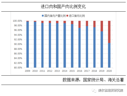 猪肉理论上是我国人民菜篮子当中“刚需”一般的存在。那么如果国内产能无法满足这个“刚需”的时候,进出口对物资的调配作用就显得至关重要。图为我国2009-2020年猪肉供应来源。2015年前,进口猪肉的供应比例不超过总猪肉供应的2%,此后逐年增加,2020年达到近10%,2020年猪肉进口总量在429.40万吨。
