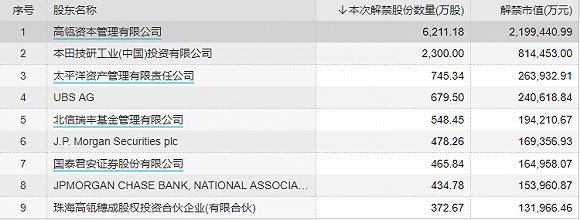根据计划,动力电池龙头宁德时代2月4日将有1.22亿股定增限售股解禁,占总股本比例5.25%,解禁市值433.29亿元。此次解禁涉及股东共9位,分别为高瓴资本管理有限公司、本田技研工业(中国)投资有限公司、太平洋资管、UBS AG、北信瑞丰基金、J.P。 Morgan Securities plc、国泰君安、JPMORGAN CHASE BANK, NATIONAL ASSOCIATION、珠海高瓴穗成股权投资合伙企业(有限合伙)。