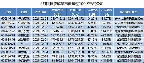 整个2月解禁数量过10亿股的公司有三家,分别为恒力石化(600346.SH)、成都银行(601838.SH)、中银证券(601696.SH)。