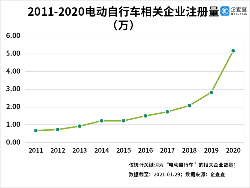 2011年以来的十年之间,电动自行车企业注册量逐年递增。企查查数据显示,2020年相关企业的注册量达到了数量和增速上的最高点,全年共新注册5.16万家,同比增长83%。据工信部统计,受新冠疫情影响,2020年一季度我国电动自行车产量为393.3万辆,同比减少31.62%,随着复工复产的推进,4月以来我国电动自行车市场回暖,2020年7月产量达到374.1万辆,较2019年同期增长22.7%。