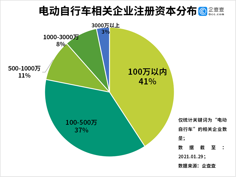 从注册资本来看(个体户除外),企查查数据显示,注册资本在100万元以内的电动自行车企业数量最多,占比高达41%。电动车自行车制造技术门槛较低,行业格局较为分散。从企业类型来看,电动自行车相关个体工商户的数量最多,共14.5万家,占比高达65%。