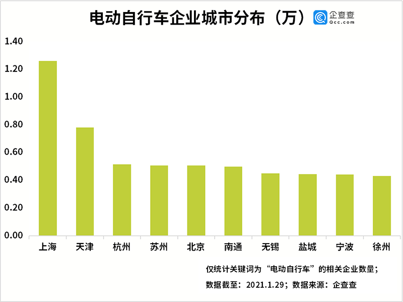 从城市分布来看,企查查数据显示,上海市和天津市两个直辖市的电动自行车相关企业数量最多,分别有1.26万家和0.78万家,杭州、苏州和北京三个城市分别以0.52万家、0.51万家和0.51万家排名前五位。