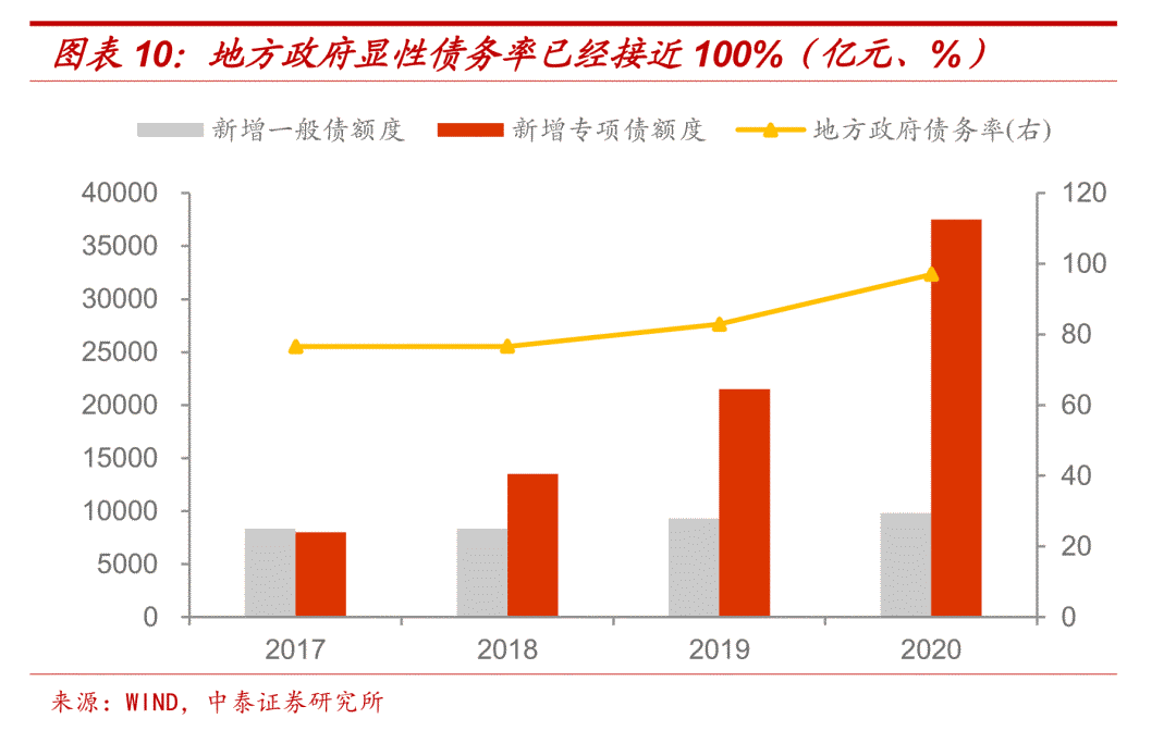 结构性问题可能导致积极财政面临挑战。1)分税制背景下,地方财政事权和支出责任不匹配,“吃饭财政”成为不少经济欠发达地区的普遍现象,地方财政压力不断上升。2)专项债对于基建的拉动效果并不理想,主要因为按照自身收益与融资能够自求平衡的要求,符合条件的项目不足,制约了资金使用效率。3)2020年末地方政府债务率接近100%,如果考虑隐性债务,不少财力紧张的地方政府可能连支付利息都有困难。近期地方再融资债累计发行接近5000亿元,但真正用于置换隐性债务的规模可能有限,大部分仍属于政府债券借新还旧,化解隐性债务难以依赖中央兜底。