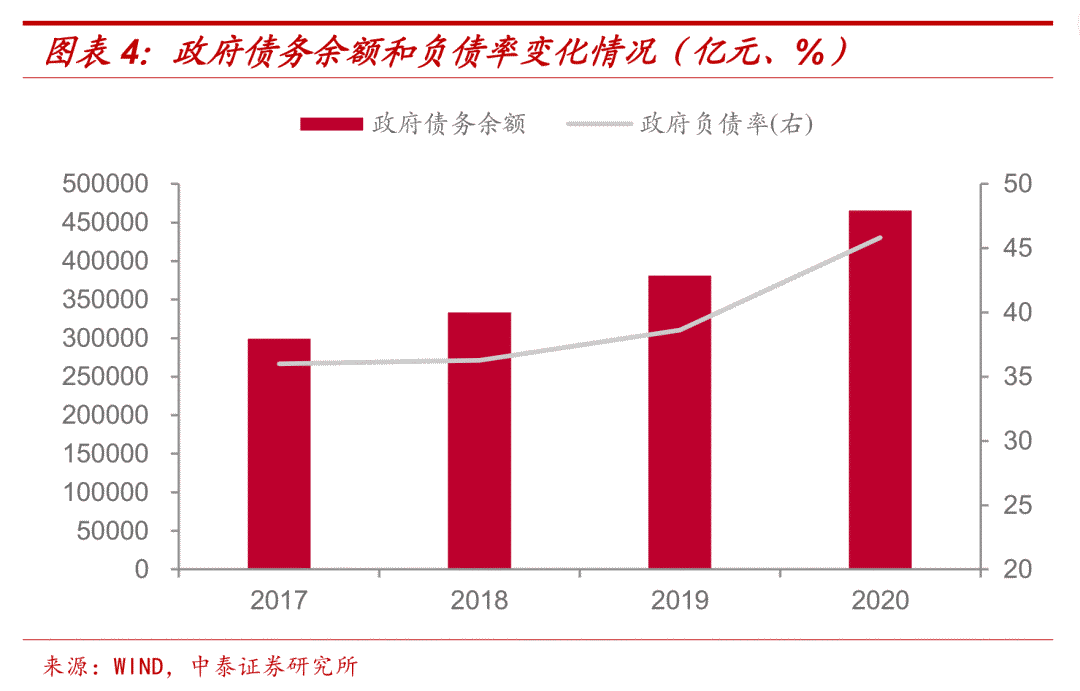 负债率大幅上升背后:积极财政托底有余,刺激不足。截至2020年末,全国政府债务余额超过46万亿元,负债率(政府债务余额/GDP)达到45.8%,较2019年大幅上升7个百分点。