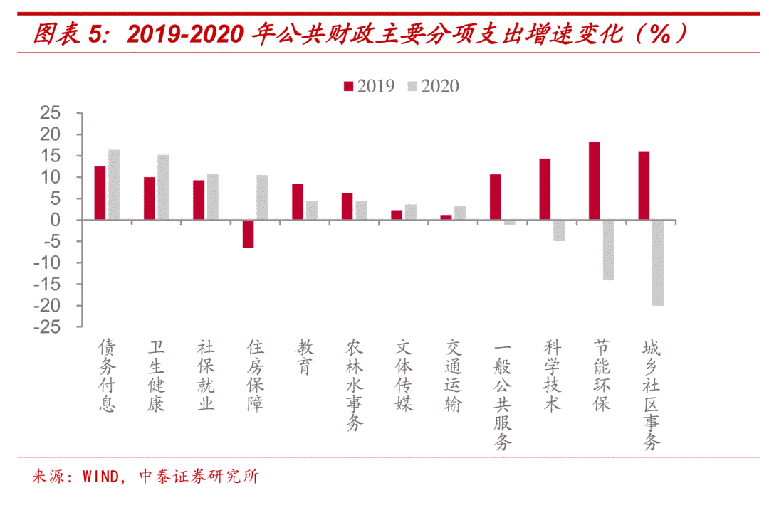 支出结构调整明显:‘压一般、保重点’。从24.6万亿公共财政支出投向看,各级政府过紧日子,一般性支出被明显压降,一般公共服务、城乡社区支出分别下降1.1%、20%,同时农林水事务、交通运输等基建相关支出增长缓慢。另一方面,重点领域支出得到有力保障,卫生健康、社保就业、住房保障支出分别大幅增长15.2%、10.9%和10.5%。此外,随着政府债务负担不断上升,去年债务付息支出接近1万亿元,同比增长16.4%。