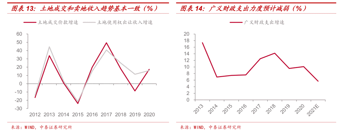 政策温和退出+土地收入增速放缓,广义财政支出力度减弱。受‘三道红线’、‘五档分类’等一系列地产融资收紧政策影响,今年房企拿地态度可能趋于审慎,预计政府性基金收入增速降至10%左右。