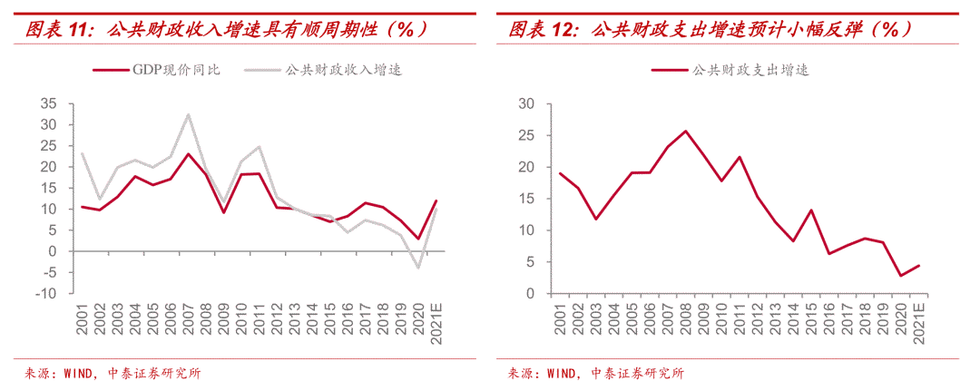 经济复苏驱动一般公共预算收支增速回升。财政收入特别是税收部分和经济增长关系密切,表现出明显的顺周期性。