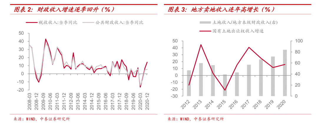 公共财政收入下滑符合预期,土地财政依赖度继续上升。2020年一般公共预算收入同比下降3.9%,基本符合去年5月份‘两会’确定预算草案时的预期。受疫情影响,一季度公共财政收入同比下降14.3%,随着疫情得到有效控制,经济逐季复苏向好,二季度降幅收窄,四季度正增长5.5%。