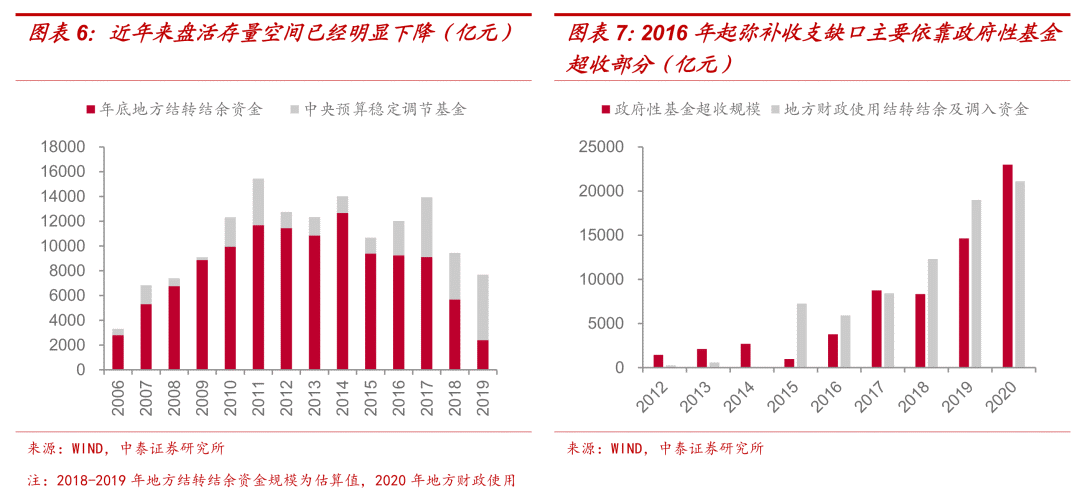 盘活存量捉襟见肘,弥补收支缺口依赖跨账簿资金调入。除发债外,平衡预算主要有三个途径。一是多渠道盘活国有资源资产增加收入,二是加大各类结转结存资金使用力度,经多年“挖潜”之后,这两类途径受限。三是增加从政府性基金预算和国有资本经营预算调入资金的规模。2020年政府性基金超收2.3万亿元,大部分预计调入一般公共预算。