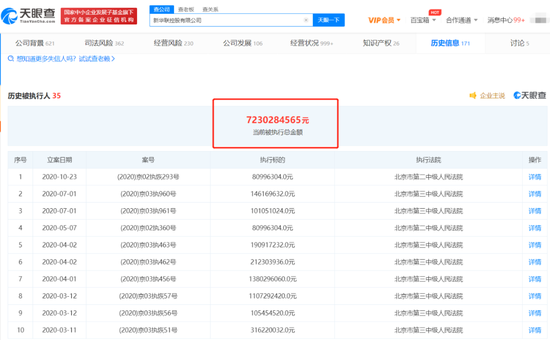 来源:亚太财险公告天眼查显示,新华联还有72亿的大小被执行案件缠身。