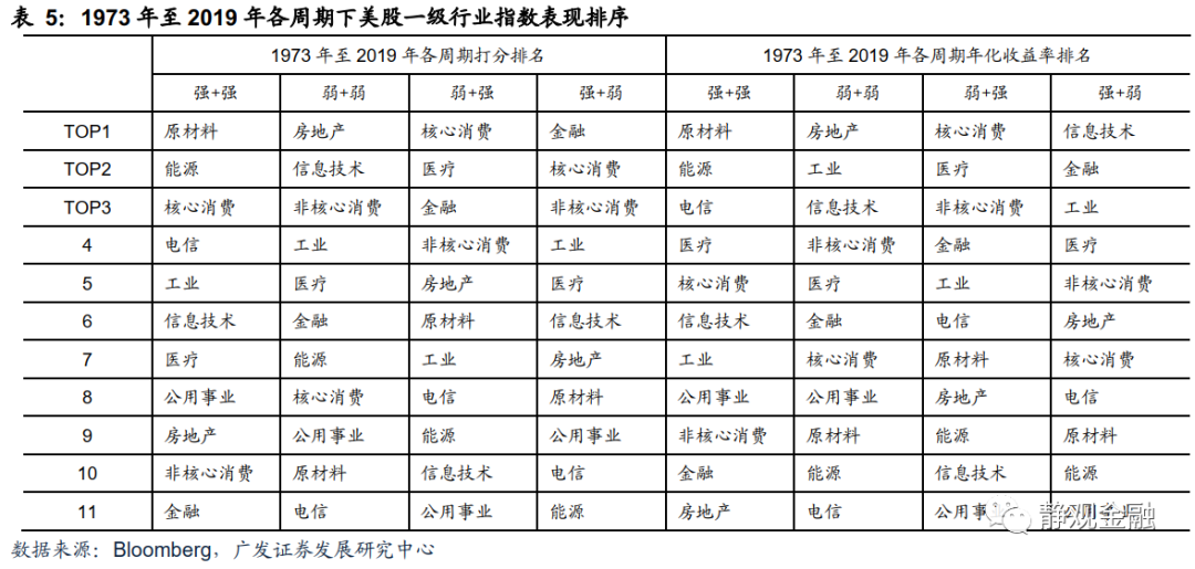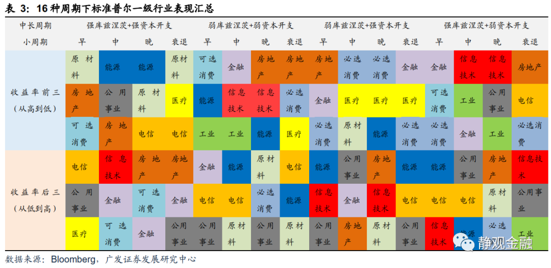 数据回溯得到如表3所示的16种经济周期下美股行业轮动规律: