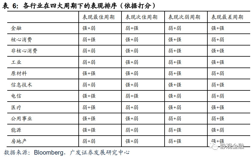 4)11个行业指数的周期轮动表现:金融行业在“强+弱”周期表现极强;核心消费行业在“弱+强”周期表现强劲;非核心消费行业在“弱+弱”周期表现最佳,在“弱+强”周期表现也不错;工业行业在“弱+弱”周期与“强+弱”周期较好;原材料行业在“强+强”周期表现强劲,其余周期均可降低关注;信息技术行业在“强+弱”周期表现强劲但需择时,“强+强”周期与“弱+强”周期则应回避信息技术;电信行业在“强+强”周期表现较好,其余周期均可降低关注;医疗行业在“弱+强”周期最佳,“弱+弱”周期其次;公用事业行业可不予关注;能源(传统)行业指数在“强+强”周期表现强劲,其余周期无需关注;房地产(类REITS资产)行业在“弱+弱”周期表现强劲,其余周期可降低关注。