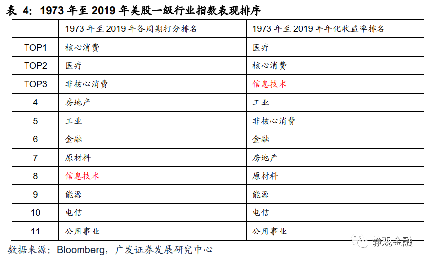 我们给每个行业在不同周期中的表现进行打分并累计分值进行排序,得到表4-6。有别于收益率和性价比排名,打分排序更易于观察行业指数的稳定性。如表4可知,1973-2019年打分结果TOP3行业是核心消费、医疗与非核心消费;1973-2019年年化收益率排名TOP3行业则为医疗、核心消费以及信息技术。整体来看,核心消费属于长期收益高且最为稳定的行业。信息技术的长期年化收益率极高,说明值得关注,但在打分排名中位列第8,说明该行业投资最需择时。此外,作为一个成熟经济体,美国能源(传统能源)、电信及公用事业等行业指数表现整体偏弱。