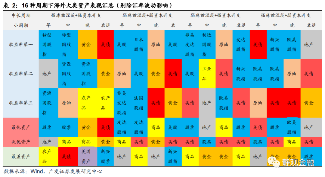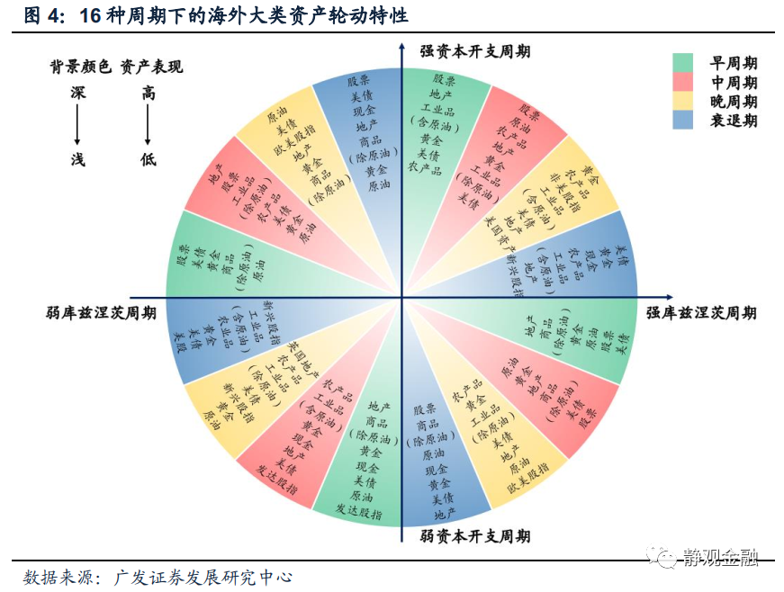 此外,再依据美国经济分析局的定义将美国每一轮资本开支周期进一步分为早周期、中周期、晚周期及衰退期。由于美国影响全球总需求及资本流动,因此我们用美国的小周期进一步将全球经济“强/弱库兹涅茨周期*强/弱资本开支周期”的四大周期划分为16个小周期(强/弱库兹涅茨周期*强/弱资本开支周期*早/中/晚/衰退期)。为了便于表达,我们姑且将这种大类资产配置模型称为“广发投资时钟”。