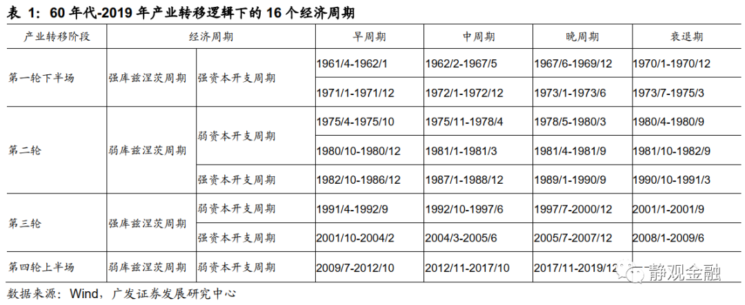 我们在报告《大类资产配置系列(一):未来5-8年全球进入大类资产均衡配置时代》中介绍了16种经济周期下的全球大类资产轮动特征。该框架基于全球经济的内生性因素——产业转移,每一轮产业转移大约20年左右,对应一轮库兹涅茨周期。每一轮产业转移因承接国经济体量差异可被分为强库兹涅茨周期(对应大型经济体)与弱库兹涅茨周期(对应小型经济体);每一轮产业转移中又嵌套两轮资本开支周期,上半场对应弱资本开支周期、下半场对应强资本开支周期。因此,我们可以得到“强/弱库兹涅茨周期*强/弱资本开支周期”四个大周期。由于上述周期均是以经济衰退为终点(起点)且结合人口等指标评估,因此具有极强的客观性。