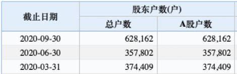 截至2020年9月30日,仍有股东户数62万多户。