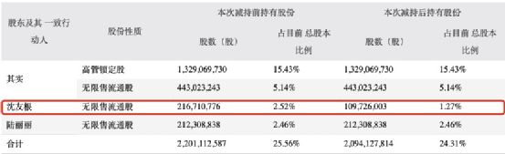 在本次减持前沈友根持有股份占总股本2.52%,本次减持后持有股份占总股本1.27%。