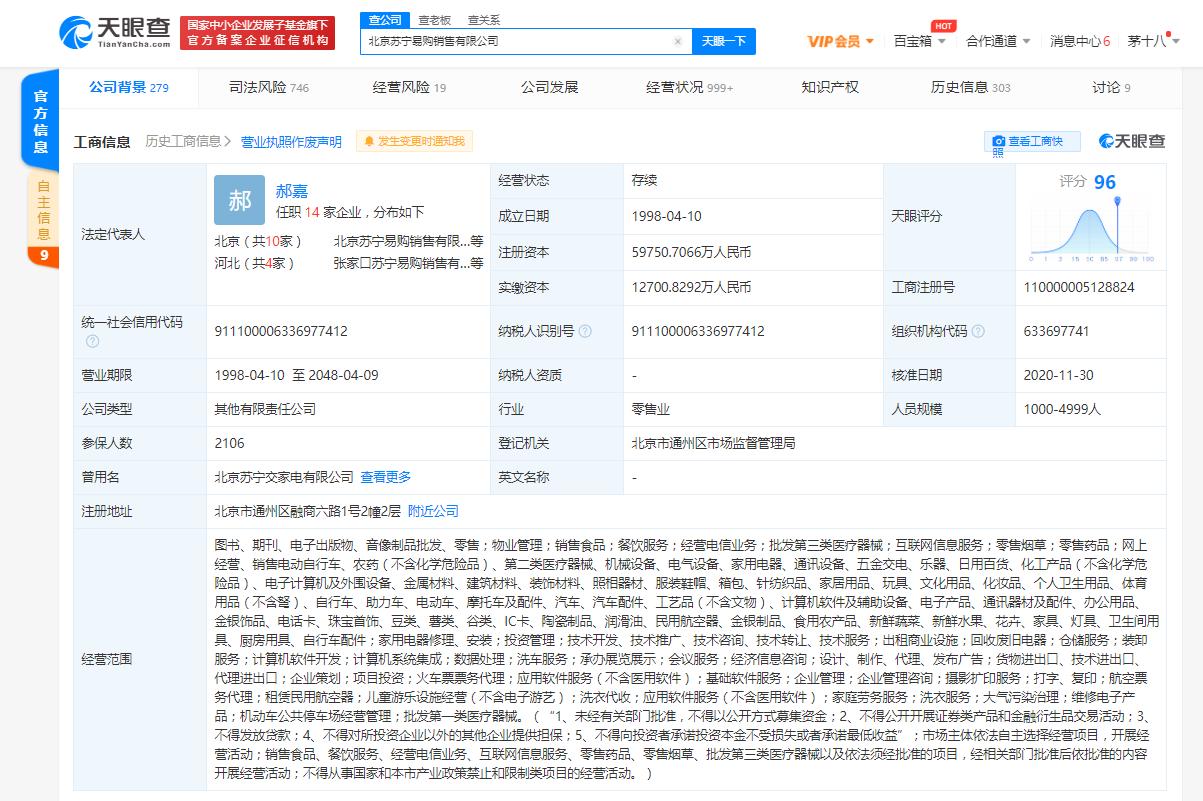北京苏宁易购销售有限公司成立于1998年4月,注册资本约6亿人民币,疑似实际控制人为张近东。