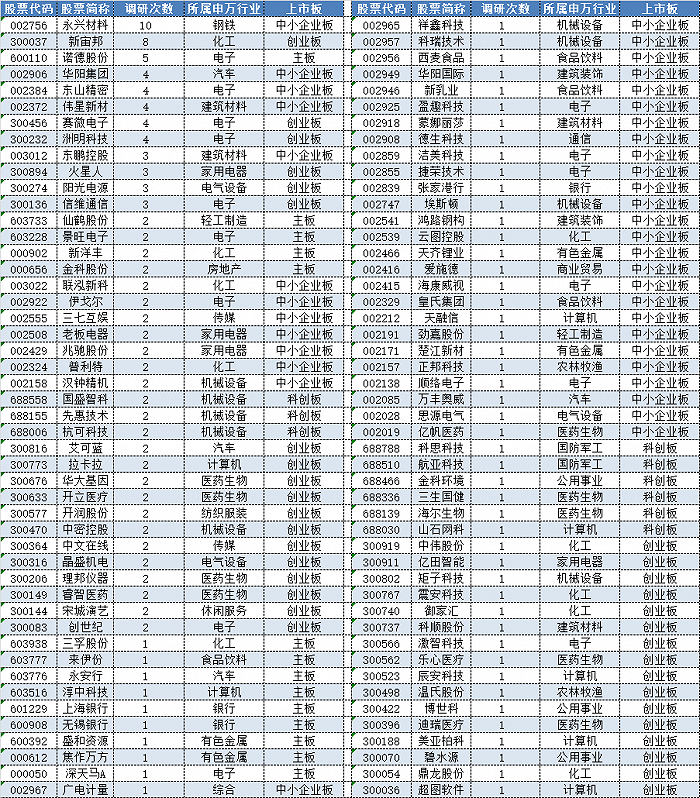 个股方面,被调研次数最多的是永兴材料(002756.SZ),1月份吸引到盘京投资、聚鸣投资、敦和资产、彤源投资、趣时资产、星石投资、于翼资产、玄元投资等8家百亿私募共计调研10次,其中盘京投资、于翼资产在1个月内两次调研该公司。