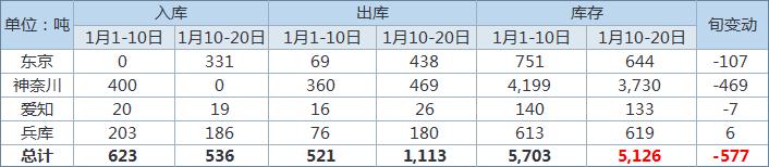 以下为截至1月20日RSS指定仓库入库、出库及库存统计表: