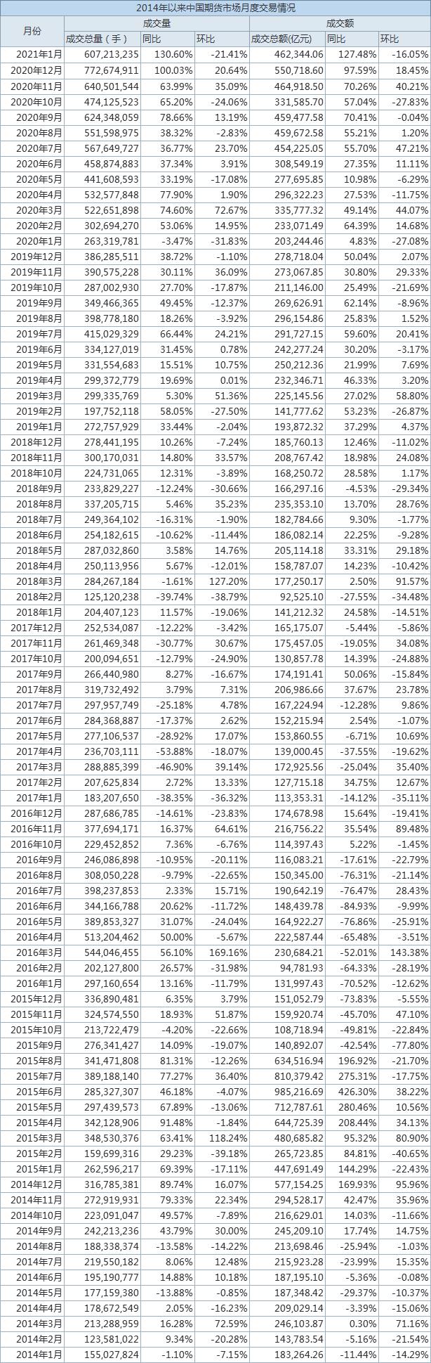 中国期货业协会最新统计资料表明,1月全国期货市场交易规模较上月下降,以单边计算,当月全国期货市场成交量为607,213,235手,成交额为462,344.06亿元,同比分别增长130.60%和127.48%,环比分别下降21.41%和16.05%。