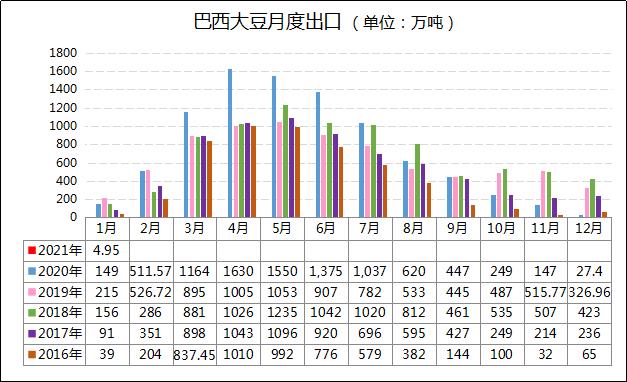巴西政府周一发布商品出口数据显示,1月巴西大豆出口量仅为49,498吨,较上年同期大幅减少96.5%,为2014年同期以来最差表现,因该国的收割严重推迟。2014年1月时,该国出口装船30,500吨大豆。