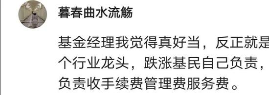 网友“暮春曲水流觞”忿忿不平地说:“基金经理我觉得真好当,反正就是挑几个行业龙头,跌涨基民自己负责,自己负责收手续费管理费服务费。”